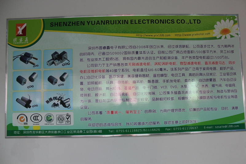 深圳市圓睿鑫電子有限公司自2008年創(chuàng)立以來,經(jīng)過誠信耕耘,在為期兩年的時間內(nèi),已通過ISO9001:2000國際質(zhì)量體系認(rèn)證。公司廠房占地面積2000多平方米,員工100人,專業(yè)技術(shù)工程師6名,擁有國內(nèi)最先進的生產(chǎn)和檢測設(shè)備,年產(chǎn)各類減速電機超過2~300萬臺。因公司發(fā)展需要,于2020年底,將生產(chǎn)基地遷往擁有最美小鎮(zhèn)之稱的東莞市清溪鎮(zhèn),依山傍水,依托美麗的大自然環(huán)境和地方文化,全新的東莞市圓睿鑫電子有限公司將借助深圳母公司平臺,一步步走上新的臺階。 東莞公司將繼續(xù)致力于生產(chǎn)銷售各類無刷減速電機 渦輪渦桿電機,微型減速電機,直流減速馬達,交流手搖發(fā)電機、同步電機及空心杯電機等,電機直徑從6-60毫米為定位,系列產(chǎn)品廣泛用于智能家電、智能辦公自動化設(shè)備、智能醫(yī)療、美容健身器材、遙控模型、電動工具、高檔玩具以及其它工業(yè)驅(qū)動裝置,如高檔玩具、游戲機、麻將機、飄香器、手機發(fā)電機、柔巾機、自動噴霧器、汽車自動設(shè)施、電動牙刷、舞臺燈飾、圣誕產(chǎn)品、智能電子門鎖、VCD、DVD、水泵、氣泵、水表、煤氣閥、電磁閥、攪拌機、榨汁...